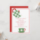 Convite de festas de chá feriado feito em branco, com um quadro vermelho ao redor da borda externa e gráficos de um pote de chá verde e uma xícara de chá com poinsetos brancos. Personalize o texto vermelho festivo para se adequar às necessidades da sua festa de chá.