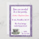 O convite bonito inclui uma xícara de chá floral no fundo do convite e está rodeada por um bonito barqueiro roxo. As informações da festa são apresentadas em roxo e rosa acima da xícara de chá. Este belo convite faz com que qualquer convidado se sinta bem-vindo.