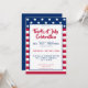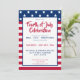 Convite moderno para comemoração de 4 de julho. Personalize este modelo do convite de festas de 4 de julho para a sua celebração do dia da independência com amigos e familiares. Possui riscas e estrelas vermelho patrióticas, brancas e azuis.