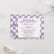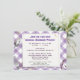 Capturar a diversão de um piquenique ou de um CHURRASCO ao ar livre com este convite de festas divertido. O texto personalizado fica no topo de um guardanapo de papel contra uma toalha de mesa gingham roxa. A refeição acabou e os restos permanecem incluindo anéis de bebida na toalha de mesa e na servette. E o que é mais: o inimigo de piqueniques, formigas, está visitando. O padrão de gingham se repete no reverso e mais formigas chegaram a ser escavadas. Disponível em cores alternativas com produtos correspondentes.