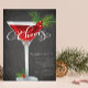 Diversão do CÉREBRO moderno! Retro Holiday Cocktail Convite de festas com um copo de martini vermelho festivo com holly sobre o caule colocado sobre um fundo de chalkboard preto popular e tradicional. Excelente para uma festa de véspera de ano novo, festas de Natal, festa de natal, festas de escritório, festa da árvore de Trim ou qualquer festa especial de inverno se reúnem.