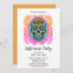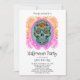 Um ousado na sua cara, convite de festa do Dia das Bruxas, com crânio de açúcar pintado em laranja, turquesa e rosa quente, em fundo de quadro com uma fonte peculiar. nA parte traseira do cartão é rosa quente. Claro que chamam a atenção deles!