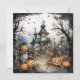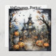 Jack-o-lanternas olha como três esqueletos dançando em frente a uma casa assombrada neste belo e divertido convite do Festa de Halloween. A parte de trás é simples, com muito espaço para o seu texto.