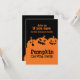 Convite à festa de esculpir abóbora do Dia das Bruxas. Apresentando abóboras esculpidas e assustadoras. Personalize com seu nome, detalhes da festa, endereço e RSVP. Ilustração e design de Sarah Trett.