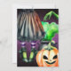 © Socialite Design Inc. & LICENSORS. Um design convite de festas de fantasia de bruxa engraçada e divertida pronto para você personalizar com seu próprio texto. A design incorpora pernas de bruxa e vassoura voadora na frente. O dorso tem uma abóbora esculpida, pernas de bruxa com saia e caldeirão fervente.