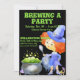 Uma bruxa engraçada, de cabeça vermelha, vestida de púrpura de seu chapéu para suas botas esquisitas (exceto suas meias riscadas) segura uma colher acima de uma caldeira fervendo com bolhas verdes. Seu gato preto olha em aprovação. Aos seus pés e aos pés do pote redondo, metálico são cogumelos coloridos. O fundo, frente e trás, é preto. Foi selecionada uma fonte interessante de "Olhos" para as linhas mais proeminentes do tipo, todas em um verde brilhante para combinar com o pinto da bruxa. Para a RSVP, utilizámos "Apenas Lamenta". Entretanto, se você quiser um RSVP diferente, há espaço para uma linha extra ou duas. Assim como há espaço, nas costas, para as direções do seu local se sentir que os seus convidados podem usar a ajuda. Também nas costas, nossa bruxa adorável está cavalgando sua vassoura no céu noturno acima de um casal de Jack o'lanternas.