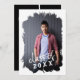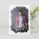Barato de convites e anúncios de festa de formatura impressos personalizados com um modelo simples para personalização. Esse design preto e branco em negrito apresenta um quadro pintado angustiado que borda sua foto de sangria de cheio com fontes de script escovadas. Adicione uma foto e personalize-a com os detalhes da festa de formatura no verso. Use as ferramentas de design para escolher qualquer cor de fundo, adicionar mais fotos e alterar as fontes de texto e as cores para criar um convite exclusivo de um tipo de formando.