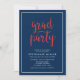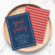 Convide amigos e família para sua festa de formatura com este convite na moda com as palavras "Partido Formando" em um script na moda vermelho contra um fundo azul com uma borda branca. A placa tem um padrão de listras brancas contra um fundo vermelho. Personalize-o substituindo o texto do marcador de posição. Para obter mais opções, como alterar a fonte e seu tamanho/cor ou o espaçamento entre letras, clique no botão "Personalizar". *Observe que a Marca d'água Zazzle que aparece na visualização de zoom NÃO aparecerá no produto impresso final © Rosewood e Citrus