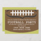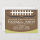 Um convite de festas de futebol que apresenta uma ilustração demasiado grande de um futebol que cobre a maior parte da superfície do convite. O plano de fundo e o inverso são verdes, mas podem ser personalizados. O texto é branco.