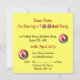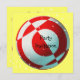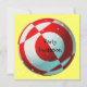 Um cartão de convite amarelo com futebol vermelho e branco, coberto de estrelas brancas.