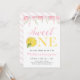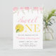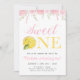 Convite para o tema Lemon, apresenta tipografia ousada, fatia de limão e flores cor-de-rosa. Perfeito para a primeira comemoração de aniversário. Personalize todo o texto editável.