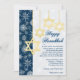 Ponha o tom para sua festa de Chanucá com este convite festivo de neve azul e branca com tom de ouro Estrelas de David e luzes cintilantes brilhantes nele. Ele é mostrado aqui no papel básico. Ele irá brilhar muito bem se você escolher o papel metálico 'Gelado'. A opção de texto e papel é personalizável. Se você precisar de outros itens correspondentes, envie um e-mail para niteowlstudio@gmail.com.