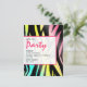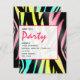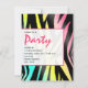 Um convite de festas genérico, com todos os objetivos, com um fundo de impressão em neon zebra, na frente e atrás. Personalize o texto rosa e preto na frente com detalhes da sua ocasião.