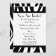 Um convite simples com um design de impressão zebra na parte superior e inferior da frente. Cortina preta e fonte parisiense preta. Personalize com detalhes da sua ocasião. O lado oposto apresenta design sólido com forma circular no meio, moldando texto.