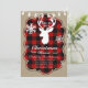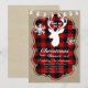Convite de festas de Janto de Natal com cervo, tema lumberjack e fundo de xadrez de búfalo vermelho. Perfeito se você está planejando uma festa de Natal rústica.