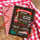 Festa de churrasco do quintal de CHURRASCO. Apresenta uma grelha retrógrada, utensílios e tipografia divertida num fundo de madeira rústica e escura. As costas estão com e gingham vermelho. Excelente para uma festa de noivado de verão, chá!