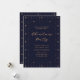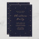 Convite de festas de Natal com um fundo de wallpaper listrado azul e dourado com um script elegante e fonte serif na qual suas informações personalizadas são escritas. Veja na nossa loja mais itens desta coleção.
