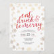 Convide seus amigos e família para celebrar o Natal com você e comer bebida e ser feliz! Este convite apresenta faíscas douradas falsas e uma bela tipografia vermelha de aquarela. Convide com estilo! As marcas correspondentes também estão disponíveis.