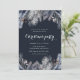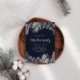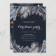 Ilustração foliar de inverno no topo e no fundo em tons de cinza e azul emparelhados com um script branco para todas as suas informações sobre um fundo azul escuro. Verifique em nossa loja mais opções de convite de festas de Natal.