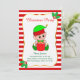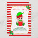 Elfo bonito e convite de festas de Natal listrado vermelho e branco. Um bebezinho bonito segurando uma caixa de presentes em fundo branco e vermelho. O texto está pronto para ser personalizado.