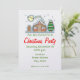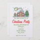 Um convite de festas de Natal com uma ilustração no topo de uma cena de neve de pão de gengibre, completo com gengibre, árvore de Natal e Papai noel dormindo com renas voando pelo céu em frente à lua.