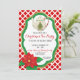 Convite para festas de Natal elegante e bonito, com um fundo de quatrefoil vermelho impressionante, com quadros verdes e de ouro, um bule de Natal e uma bela flor de poinsettia. O texto é personalizável para que possa ajustado qualquer evento que você esteja tendo.