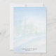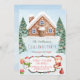 Um convite de festas de Natal festivo. Um boneco de neve, a cláusula Santa e uma casa de pão de gengibre são vistos numa floresta de neve de inverno cercada por árvores e luzes de Natal.