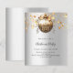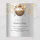 Um convite para uma festa de Natal. Um fundo de olhar mal prateado. Decorado com uma grande safra de ouro que parece bálsamo e estrelas. Personalize e adicione os detalhes. Texto preto. 1 folha = 1 convite impresso de borda a borda.