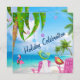 Este convite para comemoração típico do Natal apresenta duas coloridas aves de inverno e um flamingo rosa, com chapéu de Papai Noel, aproveitando a bela praia sob uma palmeira decorada com luzes e ornamentos. Alguns gráficos por trabalho de arte&@delightful-doodles.com e slslines.etsy.com
