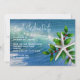 Modelo de convite de festas de Natal na praia. O fundo das ondas do oceano e o peixe-estrela com design Holly. O texto branco se alinha ao lado esquerdo do papel horizontal. Script no topo para título da parte com o restante do texto impresso. O reverso também tem uma imagem de onda oceânica. Escolha a versão impressa ou descarregável.
