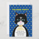 Cartão de Convite de aniversário do Pajama com um lindo gato de smoking como mensageiro e estrelas amarelas sobre fundo azul. Todo texto pronto para ser personalizado para qualquer parte.