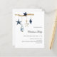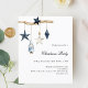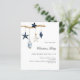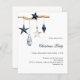 Para uma festa de Natal com familiares e amigos. Um fundo branco elegante. Decorado com decoração natalícia do estilo nórdico, escândi, um brach de madeira, estrelas azuis e brancas e um gnomo azul. Personalize e adicione os detalhes. 1 folha = 1 convite impresso de borda a borda.