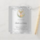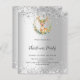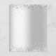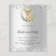 Um fundo elegante de prata. Decorado com uma coroa verde e um veado e um confete. Festa de Natal escrita com um roteiro de estilo muito tenso e moderno. Personalize e adicione as informações de sua parte. 1 folha = 1 convite impresso de borda a borda.