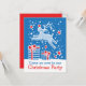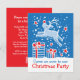 Convidado para a festa de Natal de Reindeer. Convidado de festa sazonal ilustrado com animação clara, personalize com seus próprios detalhes e código QR. Convite de festas de Natal bonito com uma rena saltando sobre presentes. Ilustrada e projetada exclusivamente por Sarah Trett para www.mylittleeden.com no Zazzle.