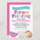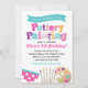 Nosso convite de aniversário original, mais vendido, da Festa de Arte de Pintura em Potéria é o convite perfeito para qualquer estúdio de cerâmica, estúdio de artesanato ou outra festa de arte e tema de pintura. Nossa design apresenta uma mistura de letras de padrão divertidas, como bolinhas, listras e diafragmas, ilustrações e gráficos de pintura de cerâmica, como uma taça de bolinhas pintada e giro, palete de tinta e pincéis de tinta. Também disponível com um plano de fundo do estilo do quadro.
