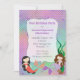Convite de festas de aniversário / piscina colorido feito em gráficos de um fundo em escala de sereia e gráficos bonitos de duas sereias. Personalize este divertido convite feminino para se adequar às necessidades do seu partido.