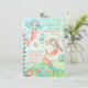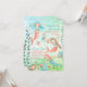 Uma aquarela pintou o convite de festas infantil com sereias submarinas cercadas por um cavalo marinho, conchas, algas e estrelas-do-mar.