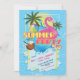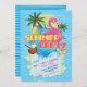 Convite para evento da Festa de Piscina de Verão com o flamingo piscina flutuante e bola de praia.