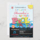 Convite de festas de Piscina de Verão para Meninas. Colocada sobre um fundo azul com elementos coloridos de piscina de verão, ondas de água azul e bola de praia. Perfeito para uma Festa de aniversário lá fora com amigos mais próximos.