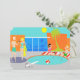 Entre! A água está boa! Este Convite de festas de Piscina retrô personalizável apresenta um desenho animado e vibrante de uma festa de piscina divertida e sofisticada. O design moderno do meio século se centra em uma piscina de natação redonda em uma cinza grande, um pátio de concreto. A piscina está cheia de água turquesa. A alvenaria laranja rodeia a piscina e há um conselho branco de mergulho de prancha pronto para uma alma aventureira. Uma bola de praia vermelha e branca está flutuando na água. Do lado oposto da piscina, dois festeiros estão pendurados na água, enquanto descansam em toalhas de praia listradas vermelhas e brancas. A mulher de cabelo preto está vestindo um maiô cor-de-rosa e com um pedaço. Ao lado dela está uma bebida tropical em um coco com um pequeno guarda-chuva e uma palha verde. O loiro está vestindo troncos brilhantes e verdes. Ele é chutado com as mãos na cabeça. À esquerda da piscina, está um homem distinto com cabelos brancos e troncos de natação de jade segurando uma bebida em uma concha de coco. Sabemos que ele é distinto porque é um homem de cabelo branco! Ele está falando com uma mulher de cabelo loiro e uma figura de ampulheta vestindo um maiô de turquesa. Um frango no braço dela é uma toalha amarela de praia. Atrás desta cena está a silhueta verde de uma palmeira e uma casa futurista, laranja, de tijolos. Através das janelas grandes, do chão ao teto, de vidro azul, você pode ver a silhueta de uma televisão, cadeira, otomano e relógio de starburst. O céu atrás da casa é uma tartaruga sem nuvens com um sol redondo, amarelo. O lado oposto do convite é a turquesa e tem bastante espaço para personalização com os detalhes do seu partido. Estes convites são para fazer um salto!