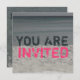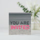 Um convite para uma foto preta / branca / colorida de uma cena de praia composta de areia, água e o céu. O aqua escuro e o texto rosa quente dizem "VOCÊ É CONVIDADO". O lado oposto apresenta fundo de foto da água do oceano. Personalize o texto com detalhes da sua ocasião.
