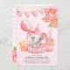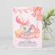 Convite de festas de primeiro aniversario de elefante rosa e bonito. Design apresenta um adorável elefante de bebê a aquarela vestindo um chapéu de festa, divertida decoração de bunting com um cupcake brilhante, um presente e um balão número um. Modelo de primeira festa de aniversário simples, fácil de personalizar usando o modelo fornecido. Fundo de aquarela e listrado com florais cor-de-rosa.