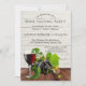 Um convite de festas elegante de provando de vinho, com um copo de vinho tinto, com uma garrafa e vinhas, sobre um simples fundo de madeira e tijolos. Bonita para uma festa de inauguração ou outra ocasião festiva.