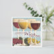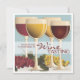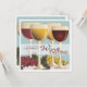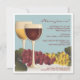 Os vidros de uma variedade de vinhos tintos e brancos, bem desenhados à mão, são aninhados entre polos de uva e fazem o design perfeito para uma festa de provando de vinho. Os vidros de vinho são delicadamente sombreados e possuem seleções deliciosas esperando apenas para serem provados como uvas maduras vermelhas e brancas derramares sobre um fundo azul-claro e macio. Oferecida aqui no estoque básico de papel, este design também seria especialmente maravilhoso em linho ou feltro. A coordenação dos selos postais também está disponível.