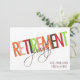 Este convite colorido de aposentadoria é excelente para qualquer descrição de cargo. É bastante versátil. Em todas as letras maiúsculas, em cores sorteadas, a uma pequena inclinação no centro do convite e com o texto da parte em cursivo escrito por baixo. É simples, mas tão eficaz. Para aquele especial que você conhece que está se aposentando...dá-lhe algo para se lembrar. Elogia-os por um trabalho bem feito enviando estes adoráveis convites para comemorar um excelente de tempo.