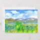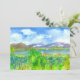 Um bom convite de festas de aposentadoria com uma pintura de paisagem aquática de uma casa perto de um lago calmo com folhagem primavera verde e montanhas roxas sob um céu nublado. Você pode personalizar o texto para ajustado das suas necessidades.