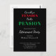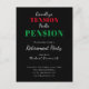 Um convite de festas de aposentadoria engraçado diz, adeus à pensão de olá de tensão. Este simples convite tem uma tipografia ousada sobre fundo negro. Nossos modelos são fáceis de usar, basta adicionar o nome e os detalhes da parte na frente e no verso, um endereço de retorno e texto adicional ou uma mensagem breve.