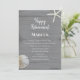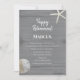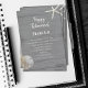 Convite de festas de aposentadoria para um homem ou mulher com dólar de areia e design de estrelas. A papelaria de fundo de madeira de cinza média tem modelos de texto brancos. Uma estrela branca do mar e um dólar decoram os cantos e o texto está em negrito roteiro escrito à mão no topo com o texto "Feliz aposentadoria". Em seguida, um lugar para o seu nome impresso em caracteres negros. Abaixo está um parágrafo para todos os textos de celebração, incluindo RSVP.