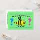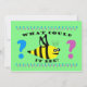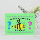O Convite de festas de Revisão de Gênero apresenta uma abelha e pontos de interrogação azuis e cor-de-rosa. Você pode mudar a parte de trás para o ajustado das suas necessidades específicas ou comprar como está e preencher mais tarde. Arte, imagem e direitos de autor © Shoaff Ballanger Studios.