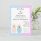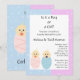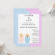 Este convite bonito tem um fundo meio rosa e meio azul que é perfeito para manter seus convidados adivinhando. Ele tem um desenho animado de dois bebês, um de rosa e outro de azul. É um menino ou uma menina? Eles não saberão até que venham à sua festa de revelação de gênero!